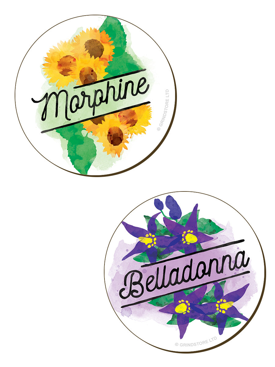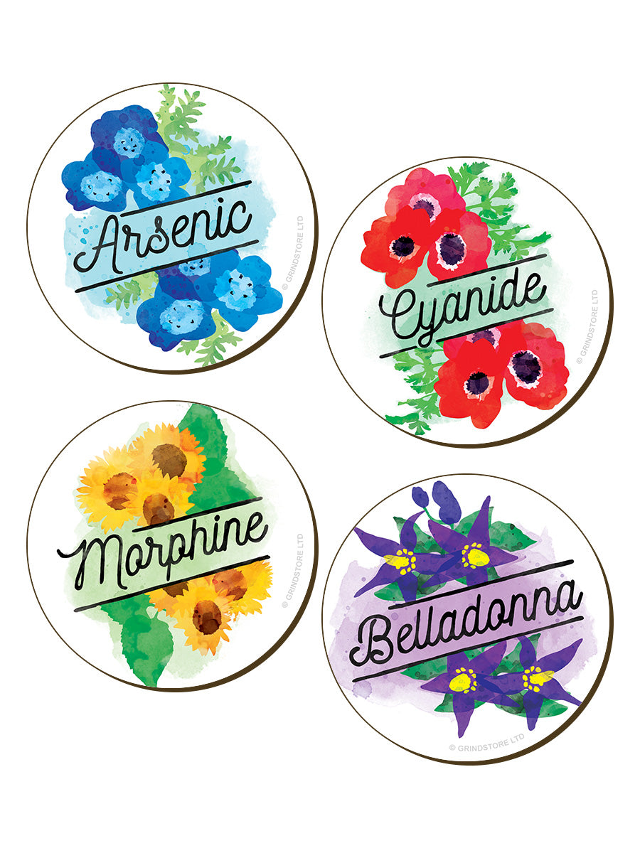 Arsenic, Cyanide, Morphine and Belladonna – Four ingredients guaranteed to intoxicate! Put the kettle on and let the mind-altering toxins from Deadly Detox take over. Each coaster is ornately decorated with a different watercolour flower arrangement, finished off with the poison name in a cursive script.