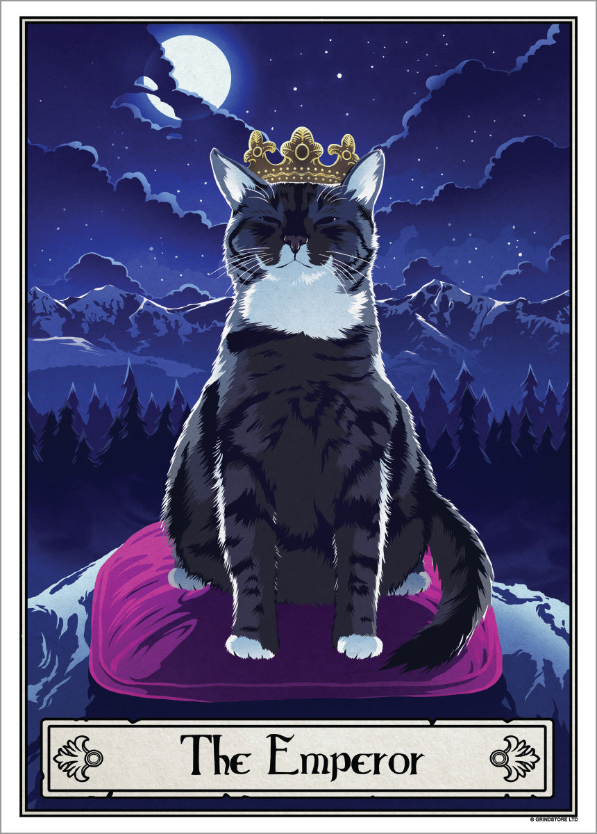 Now that is one formidable feline! Secure in his skin (or fur!), The Emperor's hard-work and determination has paid off, tenfold. Hang this beautiful mini poster in your home and feel a sense of strength and stability every time you glance at this wicked scene from Deadly Tarot.