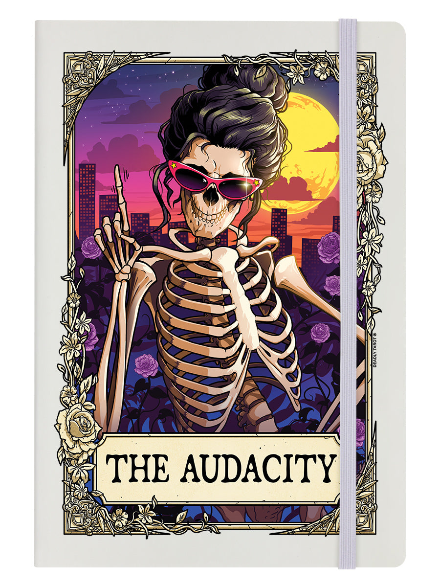 Keep all of your written creations safe in this notebook by Deadly Tarot. Taking the standard concept of tarot cards and giving them a relatable twist, these items are a must have for anyone interested it getting to pick their own card. The Audacity features on this notebook, which includes a skeleton with bight pink sunglasses and wagging their finger.