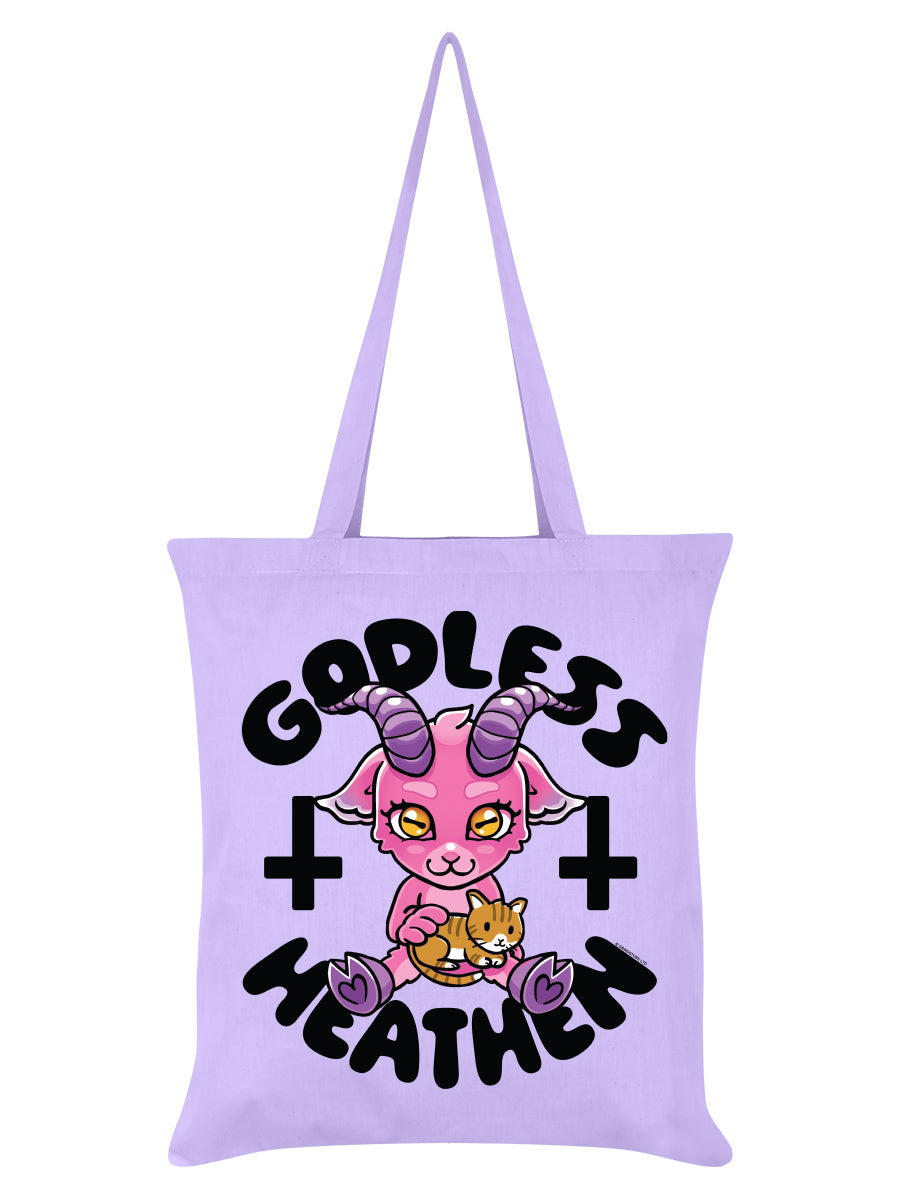 Add a pop of colour to your shopping trips with this cute lilac Godless Heathen tote bag. Featuring a vibrant pink goat with purple horns and hooves sat stroking an adorable orange striped cat, this is the perfect bag to carry all of your bits and bobs around with you in.