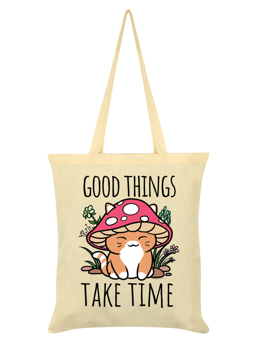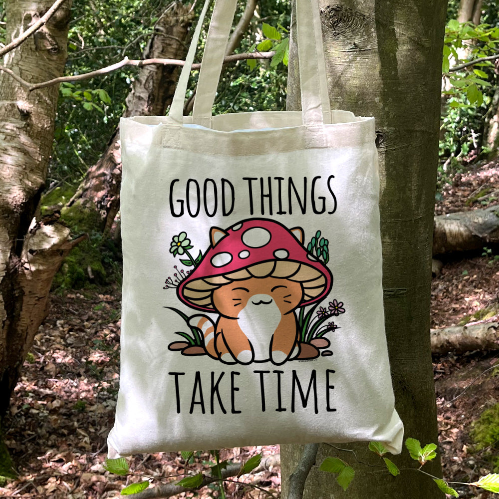 This charming tote bag features an adorable cat nestled amongst the foliage, reminding you that good things take time. A whimsical and uplifting design, perfect for carrying your essentials with a touch of nature-inspired magic.