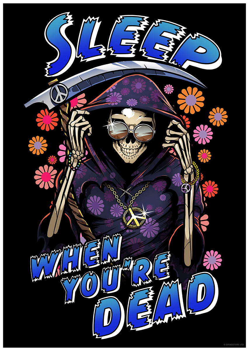 Sleep when you're dead says the happy reaper, and who are we to disagree? This is the mini poster you've been looking for as you party hard, deep into the night!