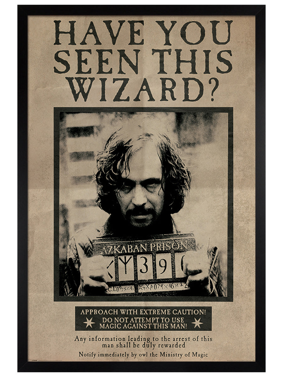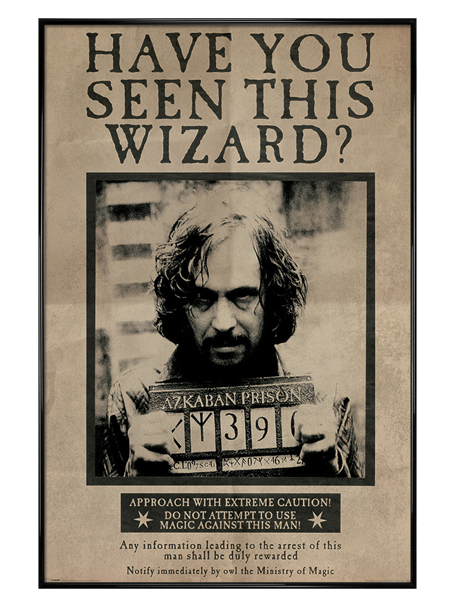 Have you seen this wizard? This fantastic Harry Potter poster sees wanted criminal Sirius Black holding his Azkaban Prison number, as the rest of wizarding world attempts to hunt him down! Designed in the style of the Daily Prophet, this will make a truly magical addition to your wall. Official merchandise.