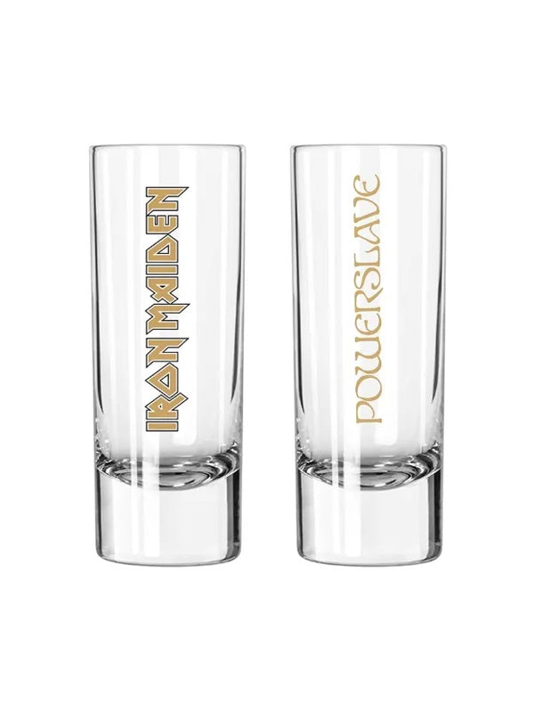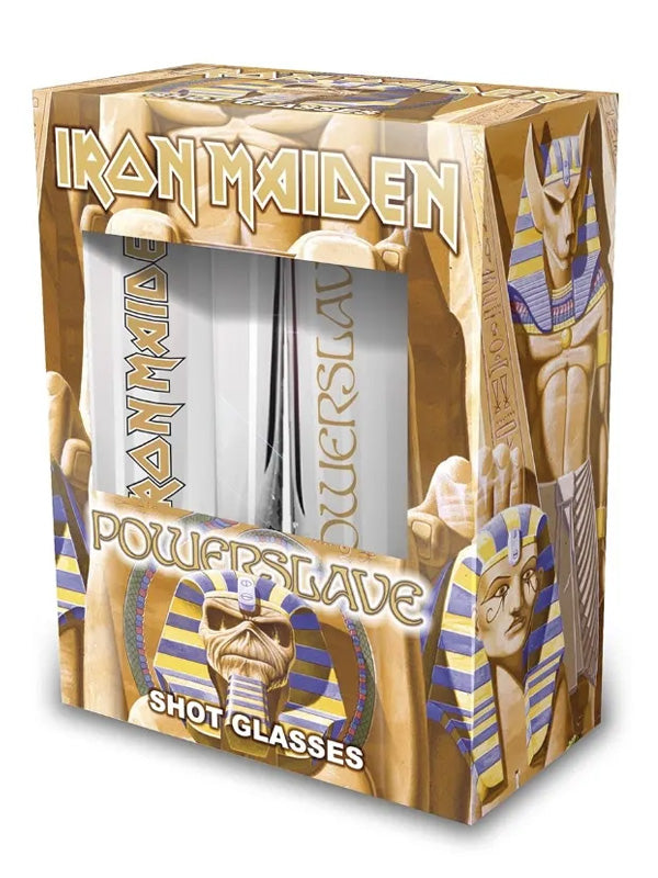 Line up the shots! Drink your favourite tipple in style with a pair of Powerslave shot glasses. An excellent gift for the Iron Maiden fan designed and sent with box. Official merch.