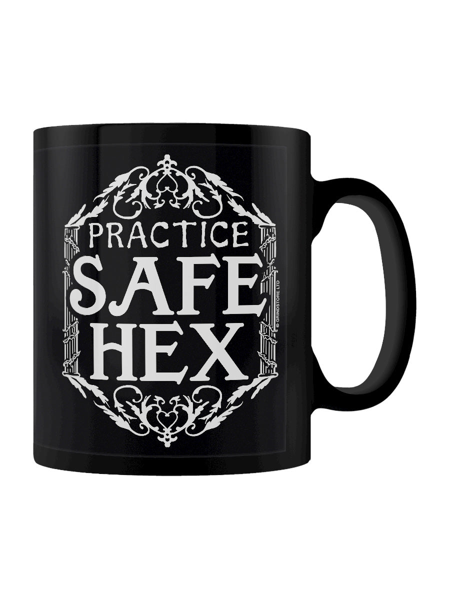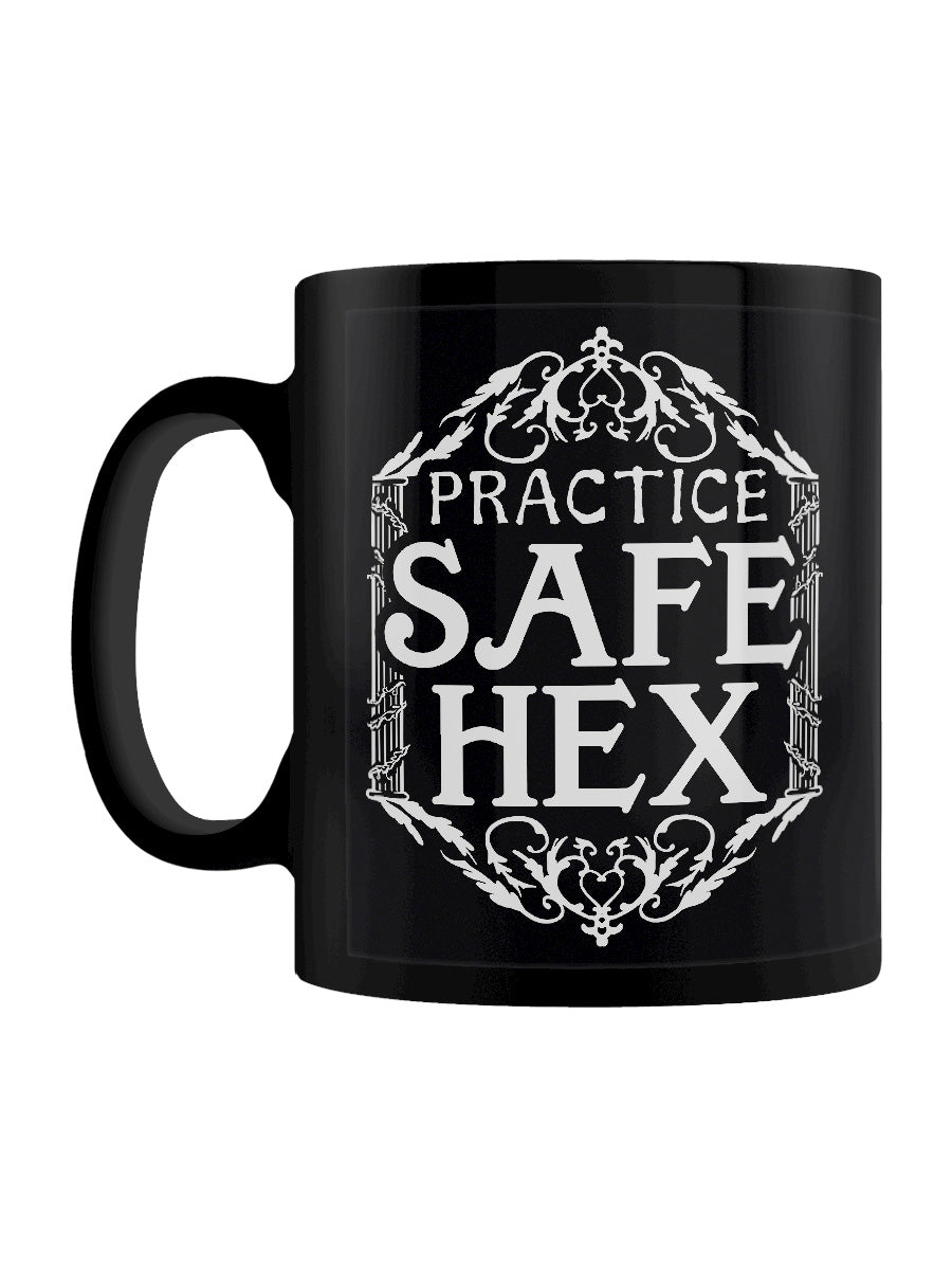 Upgrade your tea break with this black and white mug featuring a witchy pun. Encourage others around you to Practice Safe Hex. Perfect for anyone who enjoys anything witchy and fancies adding a little humour to their favourite mug.