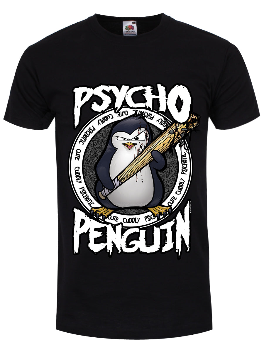 It's a combination that isn't often used when describing someone but our Psycho Penguin is not just anybody, 'Cute, Cuddly & Psychotic' is quickly becoming his trademark! This tee sees our winged psycho holding onto his blood spattered baseball bat, ready to meet his next victim.