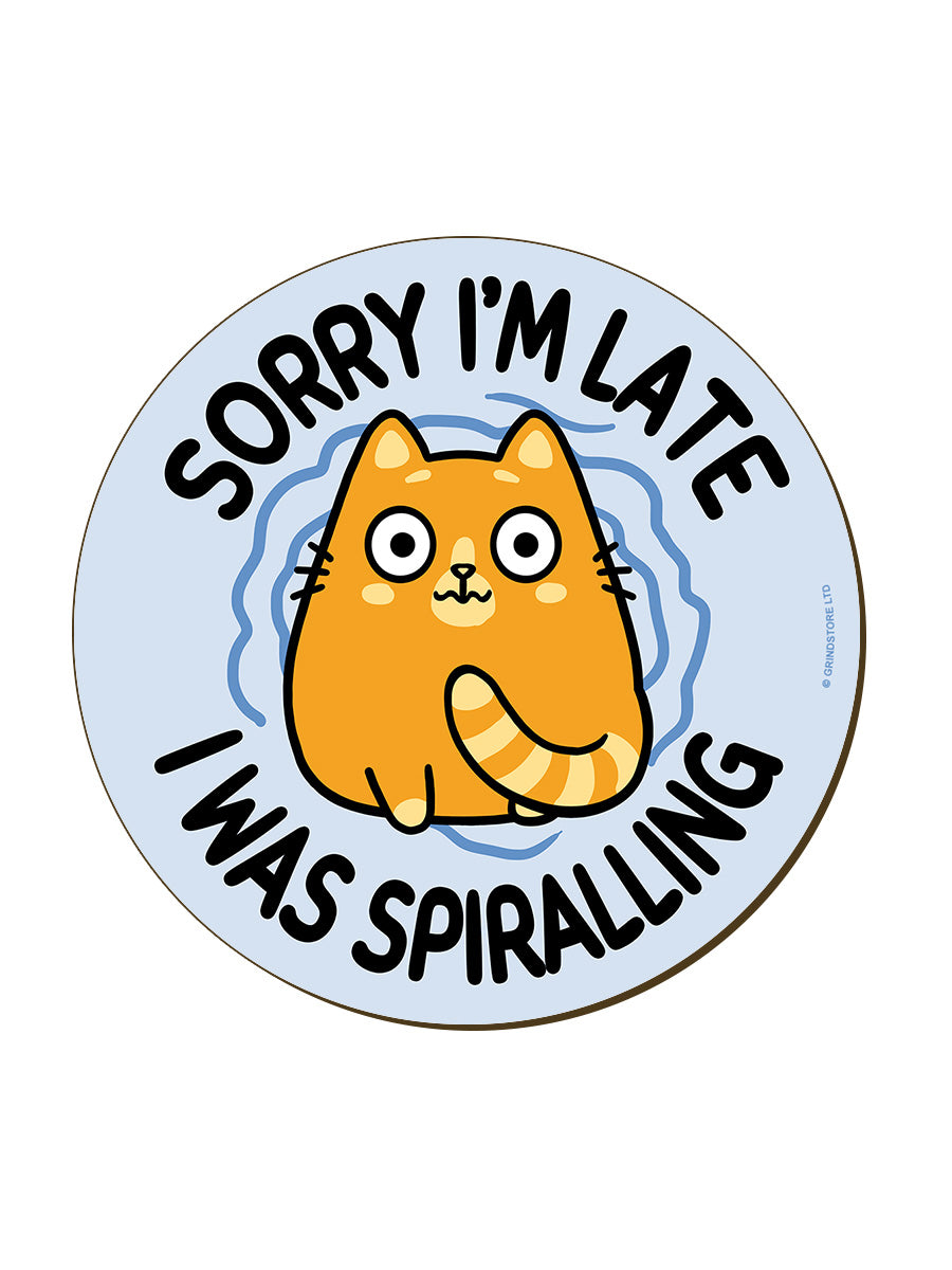 This playful coaster adds a touch of wit to personal struggles with a relatable "Sorry I'm Late, I Was Spiralling" design featuring a whimsical cat. A perfect reminder to be kind to yourself while enjoying your favourite drink.