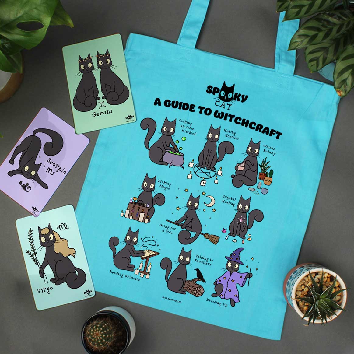 Spooky Cat is a new favourite- this cute lil kitty likes to mix it up and this time is having a try at some magic! He's stolen a witches grimoire and broom and is making the most of it. He'll be ready for a long nap after causing so much havoc! This vibrant blue tote bag is ideal for any familiar lovers.