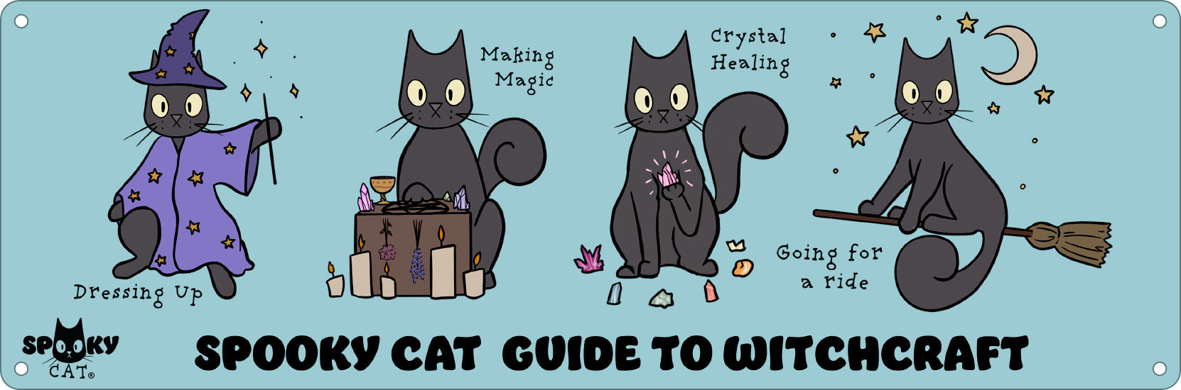 Want to be a witch? Learn from the best with this cute slim tin sign from Spooky Cat. Guiding you on a magical journey, our little kitty is keen to show you how to dress up, fly a broomstick, make magic and harness the healing power of crystals once and for all.