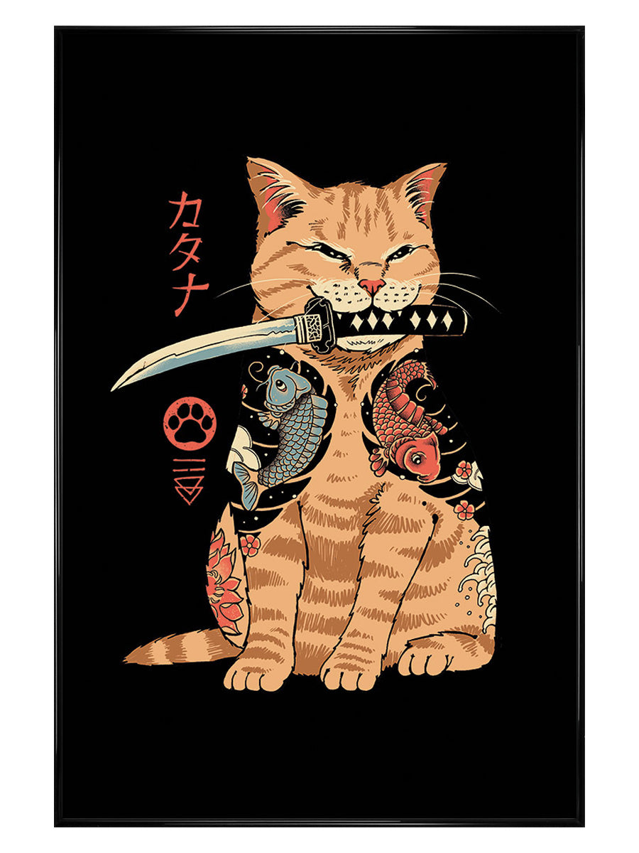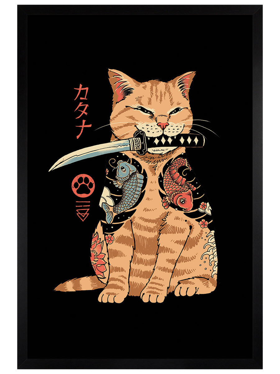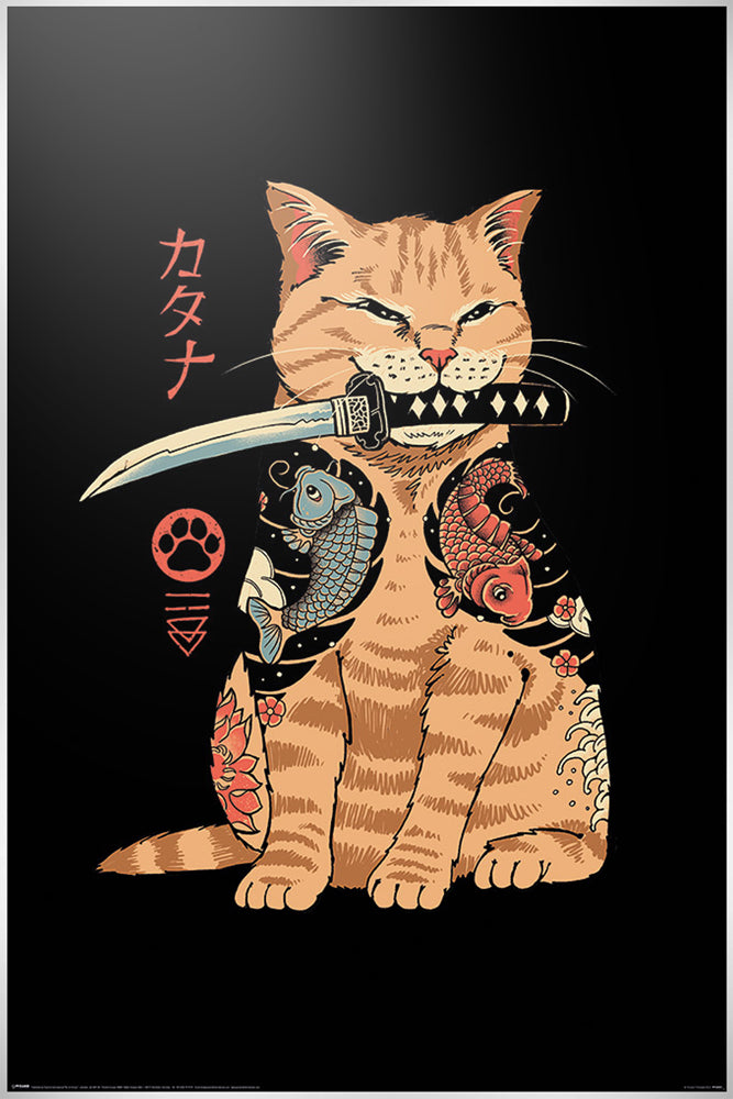 Vincent Trinidad keeps producing stunning Japanese inspired art with a humorous twist and that continues here with this pun-tastic poster. Featuring a fabulous feline wielding a katana in it's mouth, wearing a traditional jacket, this is sure to bring some Asian style to your home.