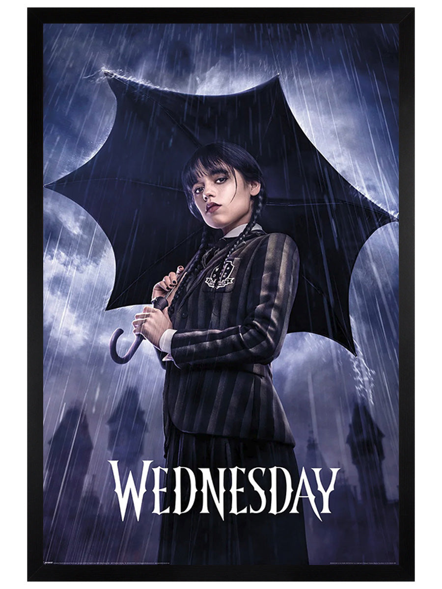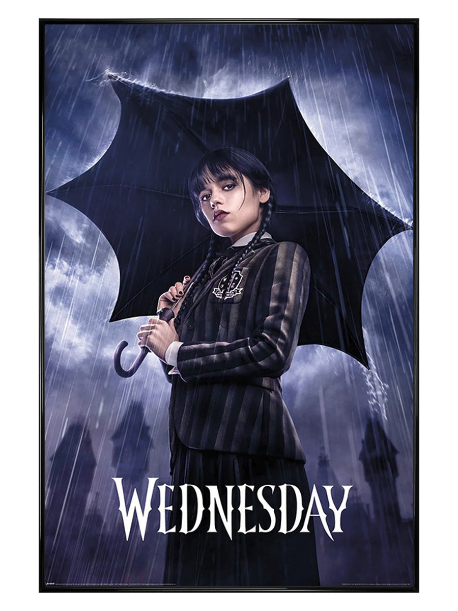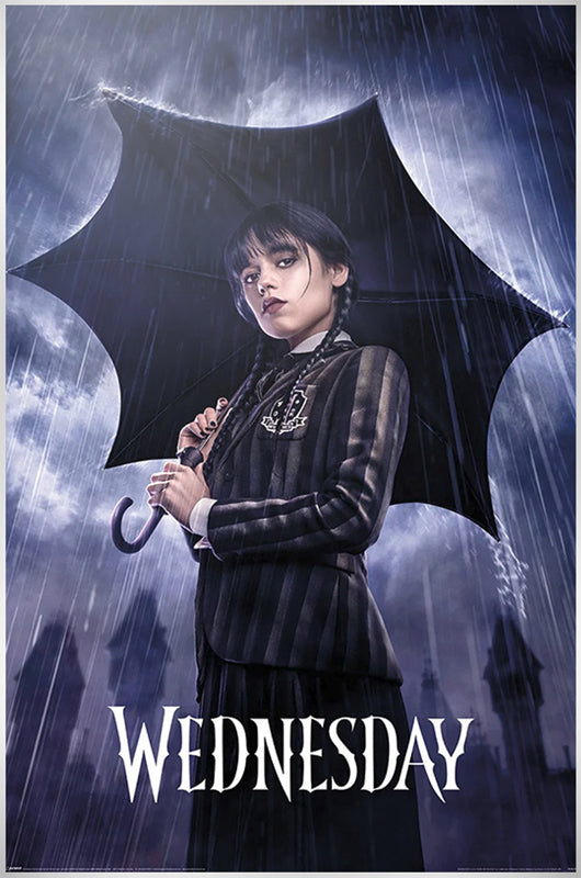 This Wednesday poster is the ultimate accessory for fans of the dark and moody TV series. This poster features a stunning print of a melancholic figure standing in the rain, with the word Wednesday in bold, white letters, making it the perfect statement piece to add to any room for a touch of brooding ambiance.
