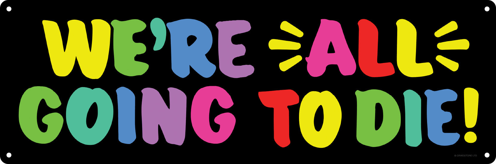 Well, the sign's not wrong! Accept the inevitable and embrace the end game with this positively radient rainbow tin sign stating, 'we're all going to die!'. Add that touch of positivity to your abode and note the emphasis on 'all'...