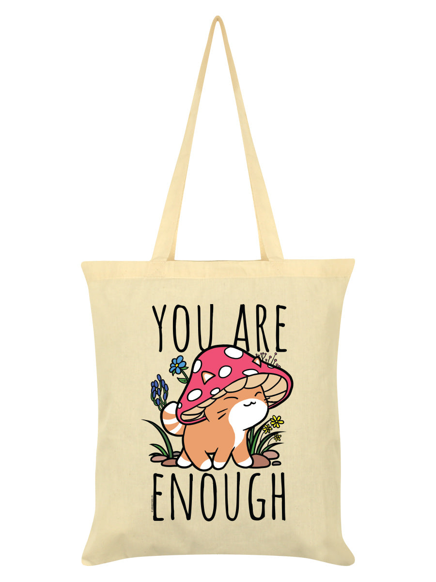 Give yourself a constant reminders that you are enough throughout the day with this cute tote bag. Featuring a cute orange cat wearing a red mushroom hat, strolling through a flower garden. This is the perfect addition for cat lovers to carry their shopping around in style.